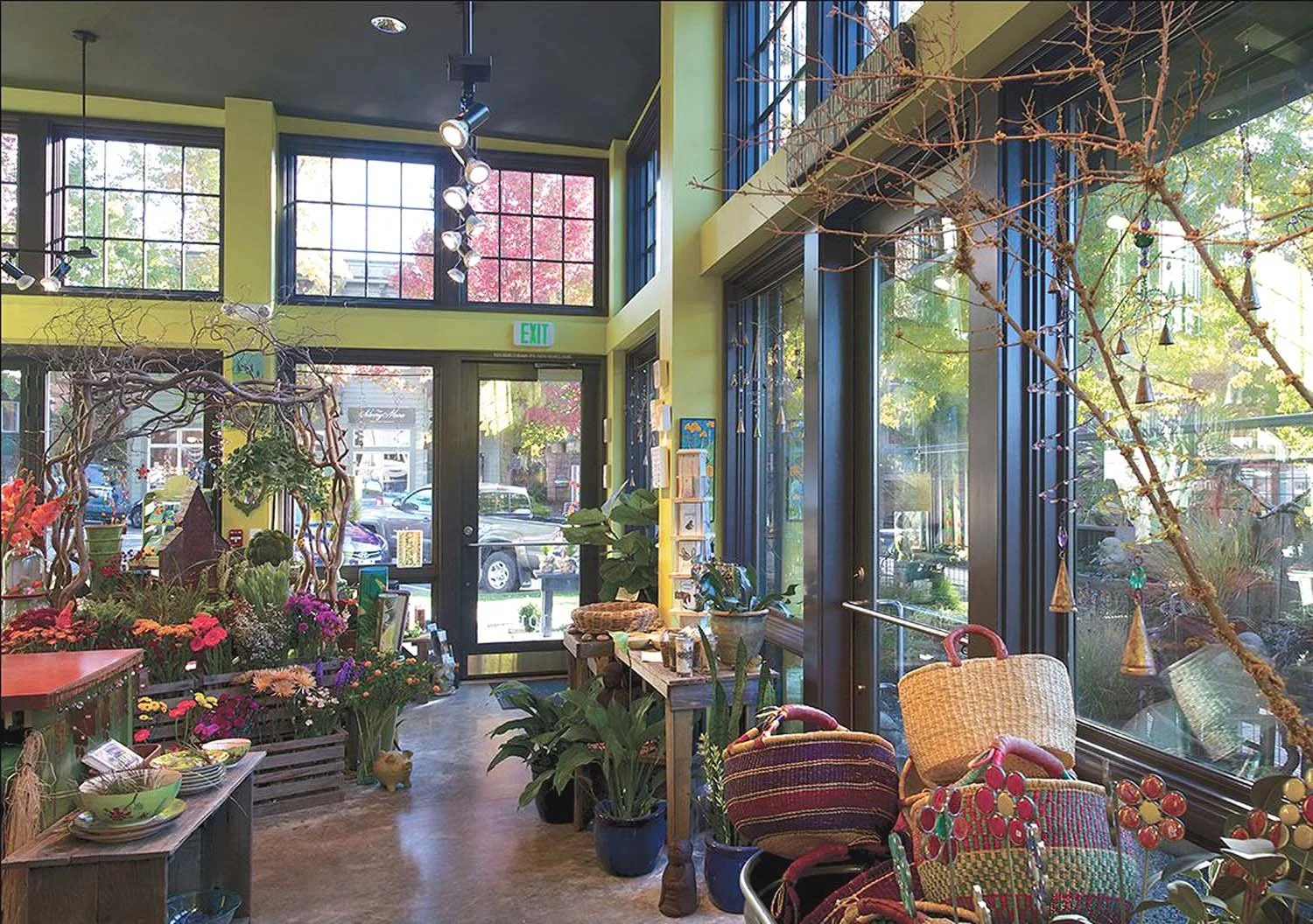Expansive storefront glazing floods the shop with natural light and strengthens its street presence.