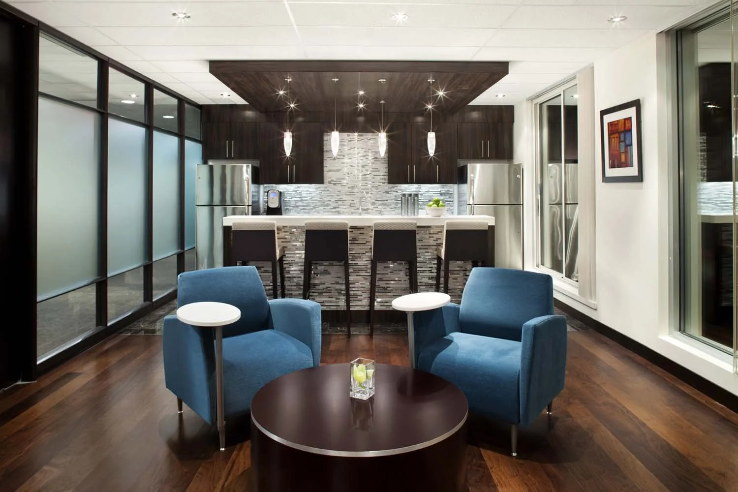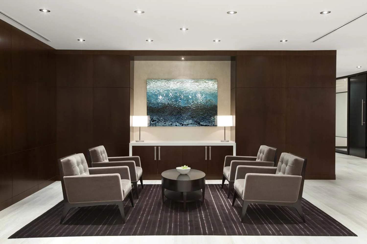 For their new 20,000-square-foot headquarters, the client sought an environment that conveyed elegance, credibility, and permanence. Private offices and conference rooms were strategically positioned along the building perimeter, while support functions were consolidated at the core of the floor plate. A glass wall system allows natural light and city views to extend deep into the interior, maintaining visual openness while preserving acoustic privacy. Open workstations, collaborative lounges, a staff bistro and coffee bar, and dedicated wellness amenities create a dynamic workplace that supports interaction, focus, and daily connection.