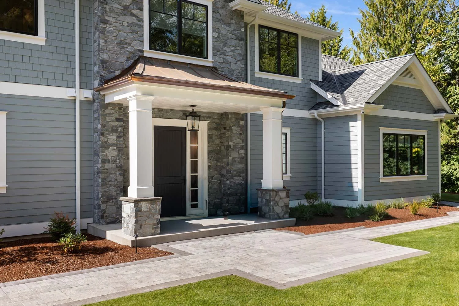 The architecture reflects a refined Northwest interpretation of turn-of-the-century coastal design, combining shingled and horizontal siding, natural stone, custom mouldings and trimwork, and a seaside-inspired paint palette with carefully detailed columns, eave returns, roof vents, pergola structures, and a porch topped with a custom copper portico roof. Expansive windows and glass doors were selected to frame the surrounding landscape while bringing an abundance of natural light deep into the home.
