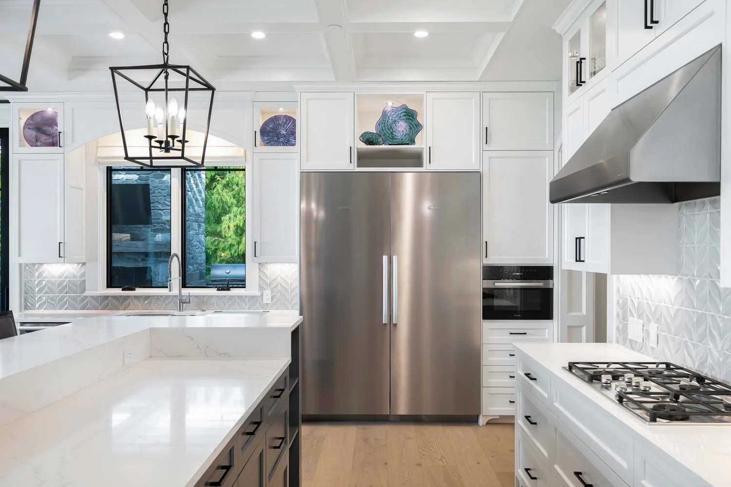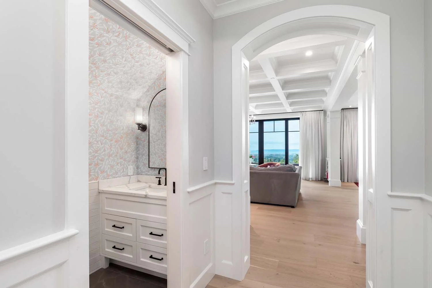 Finishes were carefully curated to reinforce the home’s coastal character, including light oak hardwood flooring, quartz and natural stone surfaces, handcrafted tiles, decorative and architectural lighting, timeless hardware, and a fresh coastal-inspired color palette. Designer wallcoverings introduce texture and visual richness throughout the home, from organic, nature-inspired patterns in the entry foyer, powder bath, and bedrooms to the vibrant accent in the otherwise utilitarian laundry room. Client furnishings and artwork from their previous residence were incorporated into the design, while furniture selection itself was outside the scope of work.