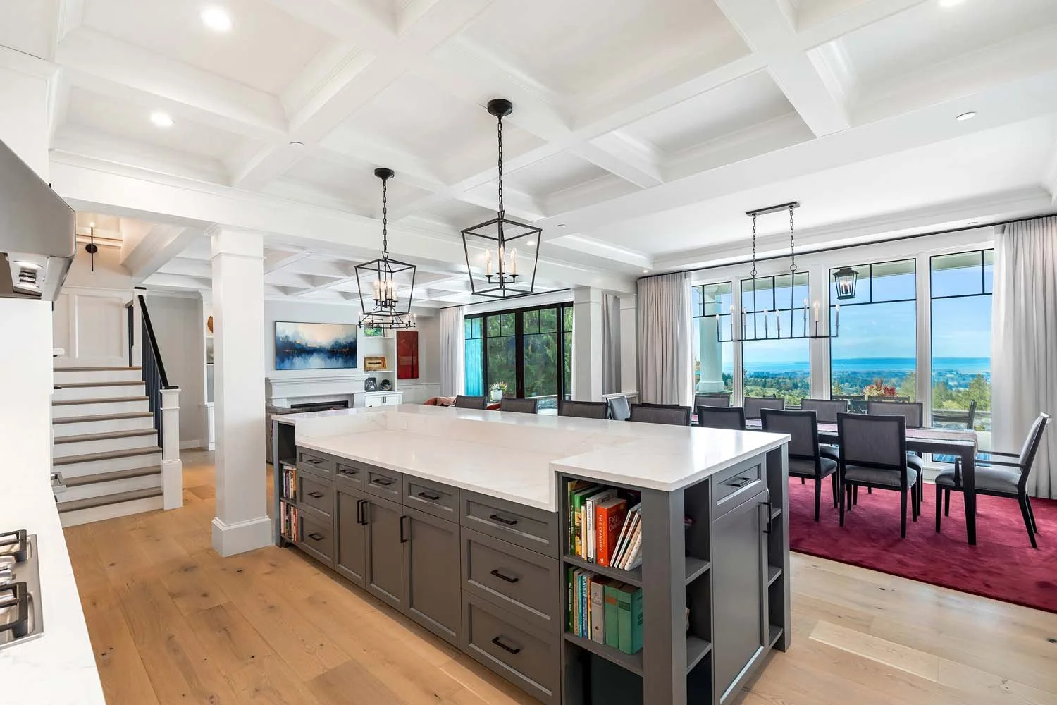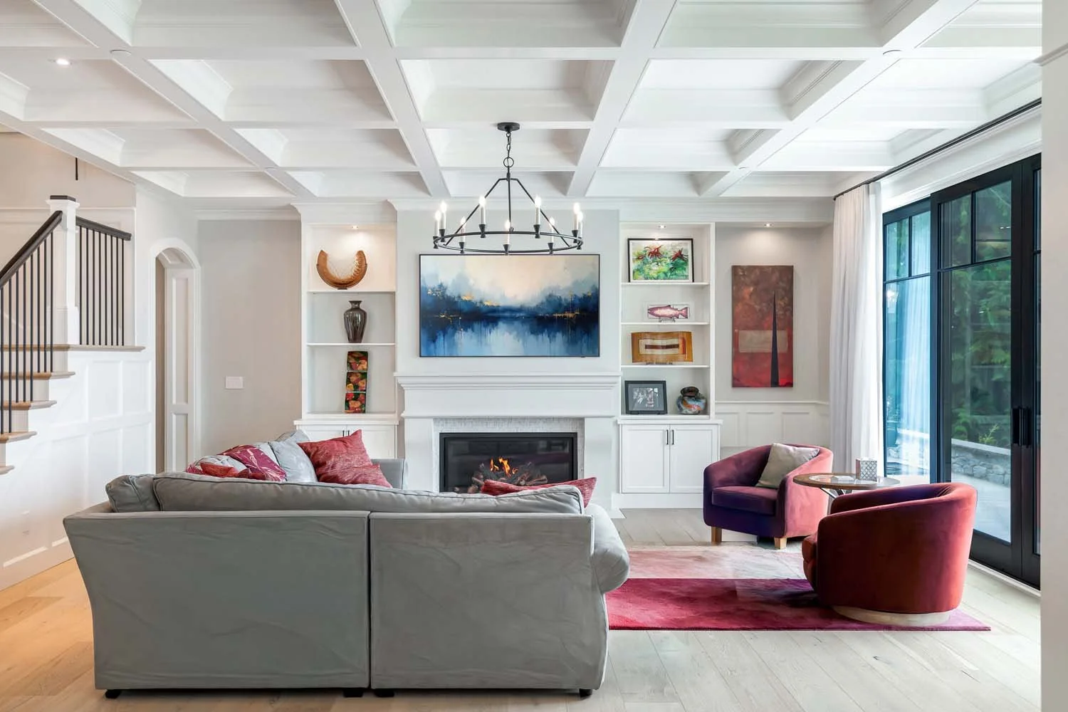 Extensive custom millwork and architectural detailing define the interiors. Coffered and box-beam ceilings, paneled wainscoting, tailored mouldings, and a finely detailed open staircase connect the primary living spaces to the second floor. All cabinetry and built-ins were custom designed, including the expansive kitchen and butler’s pantry, fireplace surrounds, window seats, bookcases, art niches, game room with wet bar, home offices, walk-in closets, and a comprehensive guest suite with kitchen. Lighting design and power plans were developed in tandem with architectural detailing to ensure visual cohesion and functional performance.
