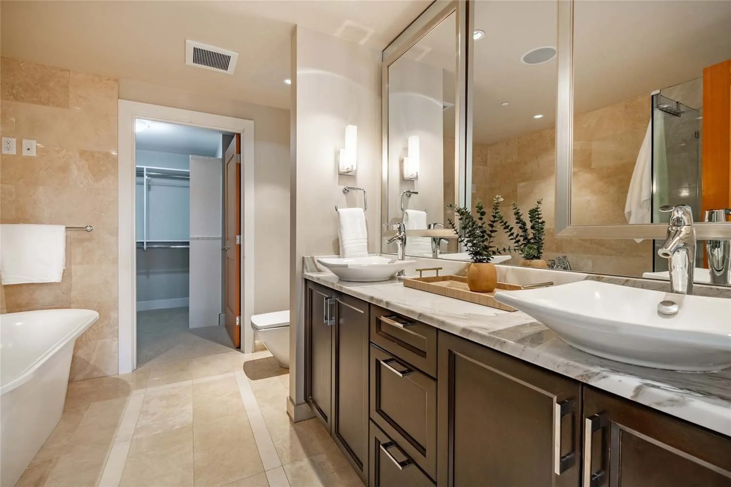 Two finish palettes were created to reflect the relaxed sophistication of a coastal retreat. Warm walnut hardwoods, natural stone, refined tilework, textured carpeting, and rich paint palettes create interiors that feel both welcoming and refined. Custom cabinetry and tailored built-ins provide continuity throughout the residences, while expansive windows frame the dramatic waterfront views.