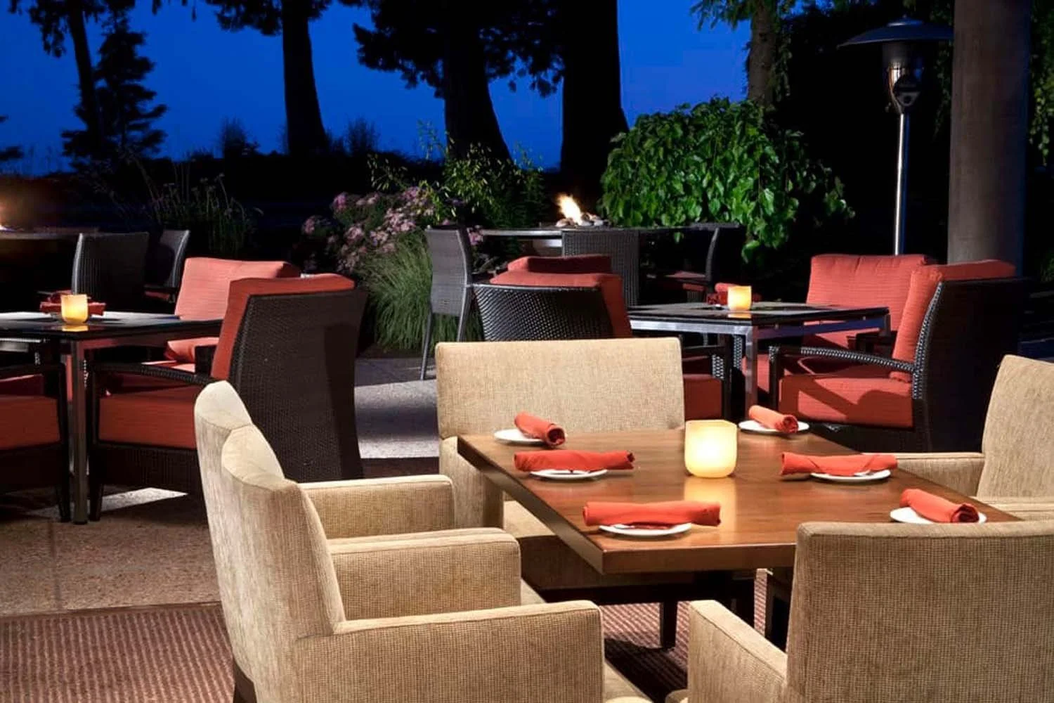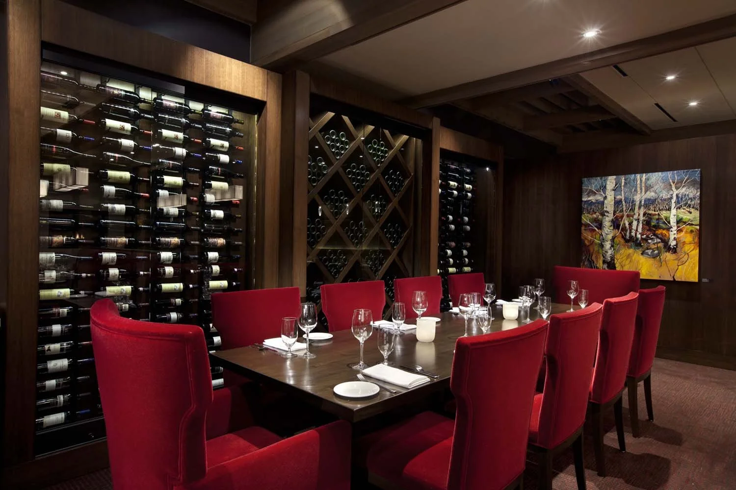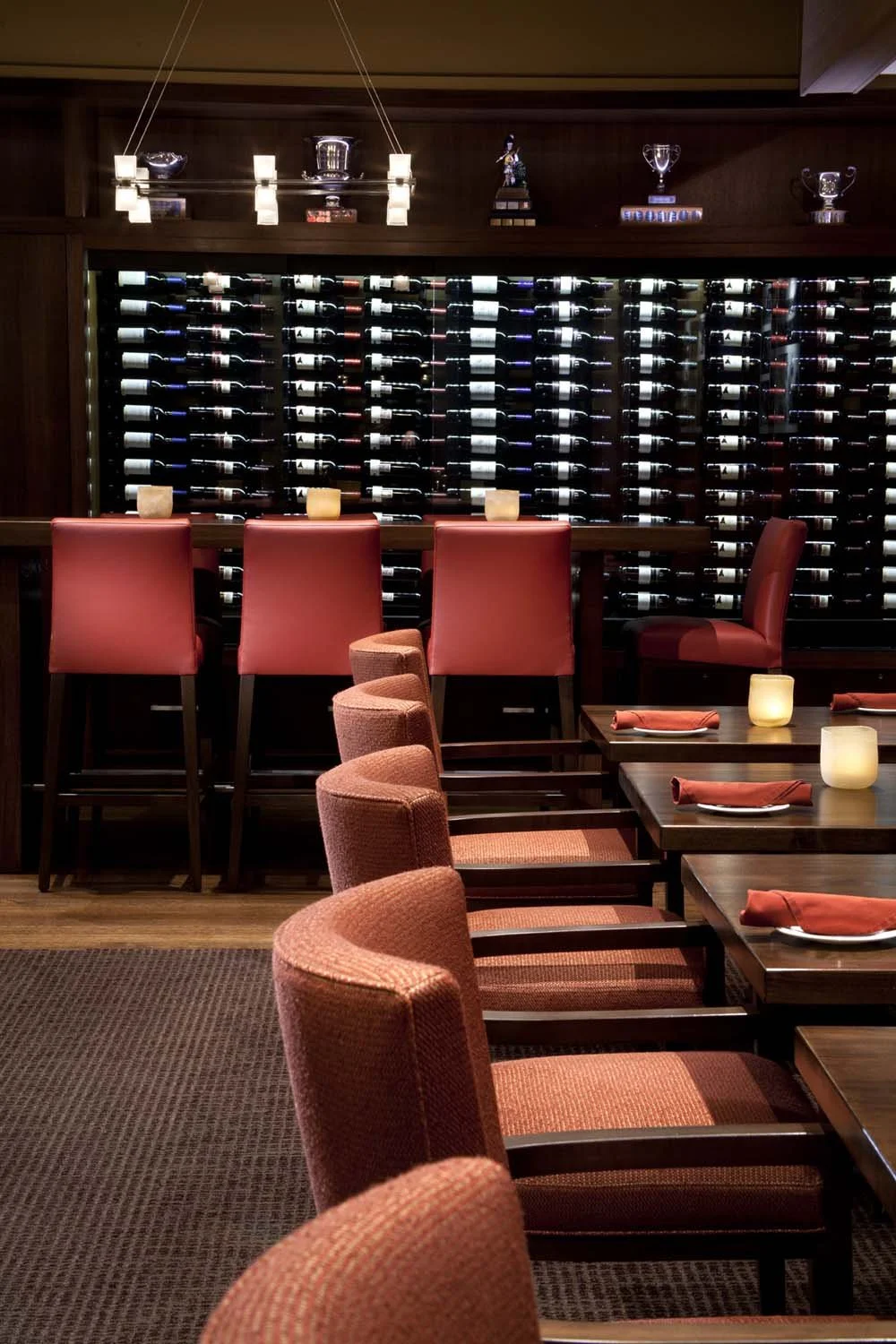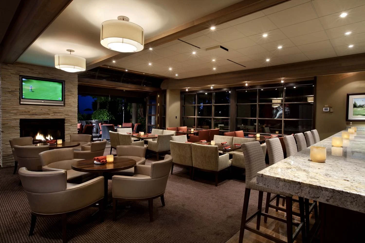 Rich walnut paneling, natural stone, custom wool carpeting, and layered decorative lighting create depth and intimacy throughout. Generous fireplaces anchor the lounge and dining areas, reinforcing the club’s legacy of comfort and permanence. A retractable glass wall system seamlessly extends the restaurant to the outdoor terrace, dissolving the boundary between interior and landscape. Custom wine display casework was designed to showcase the club’s extensive collection alongside celebrated golf awards, integrating heritage into the architectural expression. The result is a timeless, welcoming environment that elevates the member experience while honoring the club’s distinguished history.